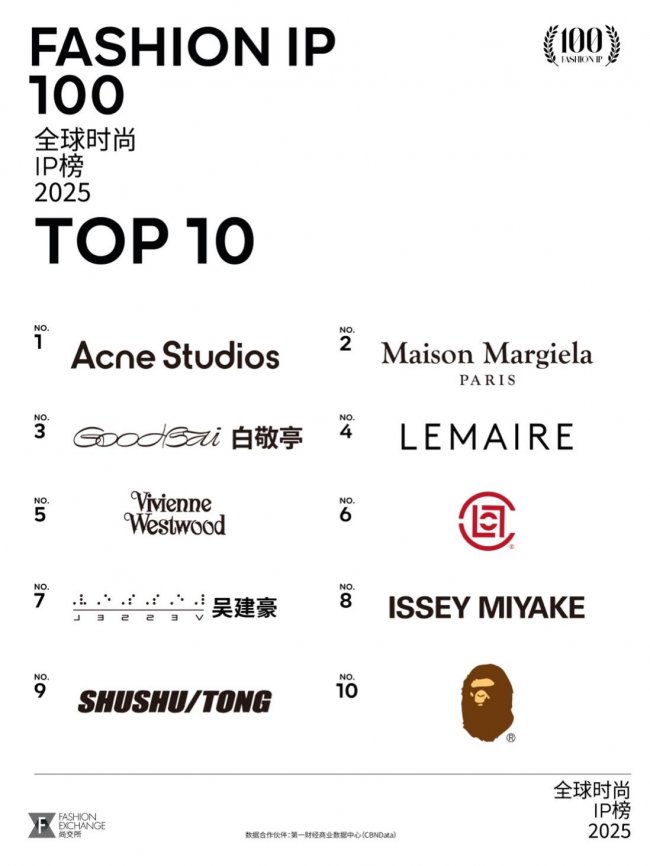 设计师及设计师品牌类时尚IP在总榜中占据74席,仍是最稳定、最具长期竞争力的群体。无论是Acne Studios、Maison Margiela、CLOT,还是山本耀司、BEAMS、Our Legacy等品牌,其共同特征都是:产品力与品牌价值的双重叠加。